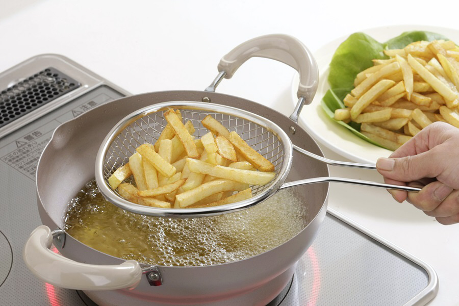 から揚げやフライドポテトなど、1度にまとめてすくうのに便利です。2度揚げにも便利!高温で揚げて一気にすくう!このひと揚げでカリッと食感に。