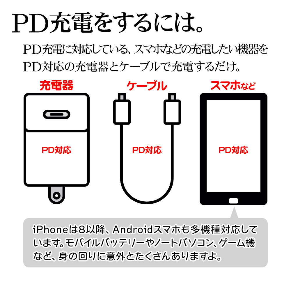 コンパクトなのに高出力なモバイルバッテリーで、iPhoneを30分で約50%充電することができます。