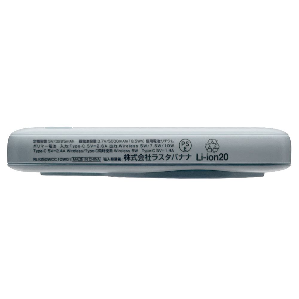 ワイヤレス充電機能(送電専用・最大10W)と、Type-Cポート(入力/出力・最大12W)を搭載したモバイルバッテリーです。
