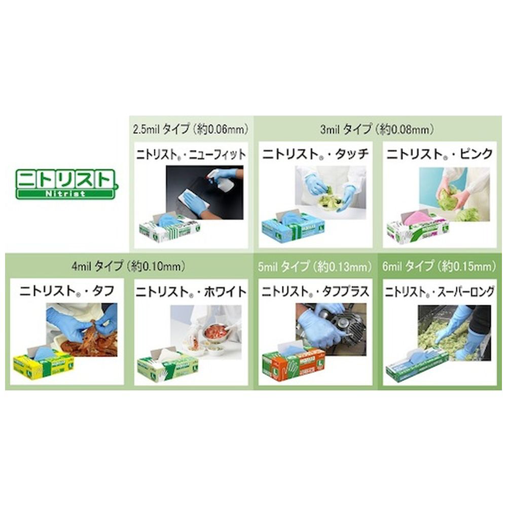 厚み約0.06mm、衛生的な粉なし(パウダーフリー)タイプの使い捨てニトリルゴム手袋(ニトリル手袋)。