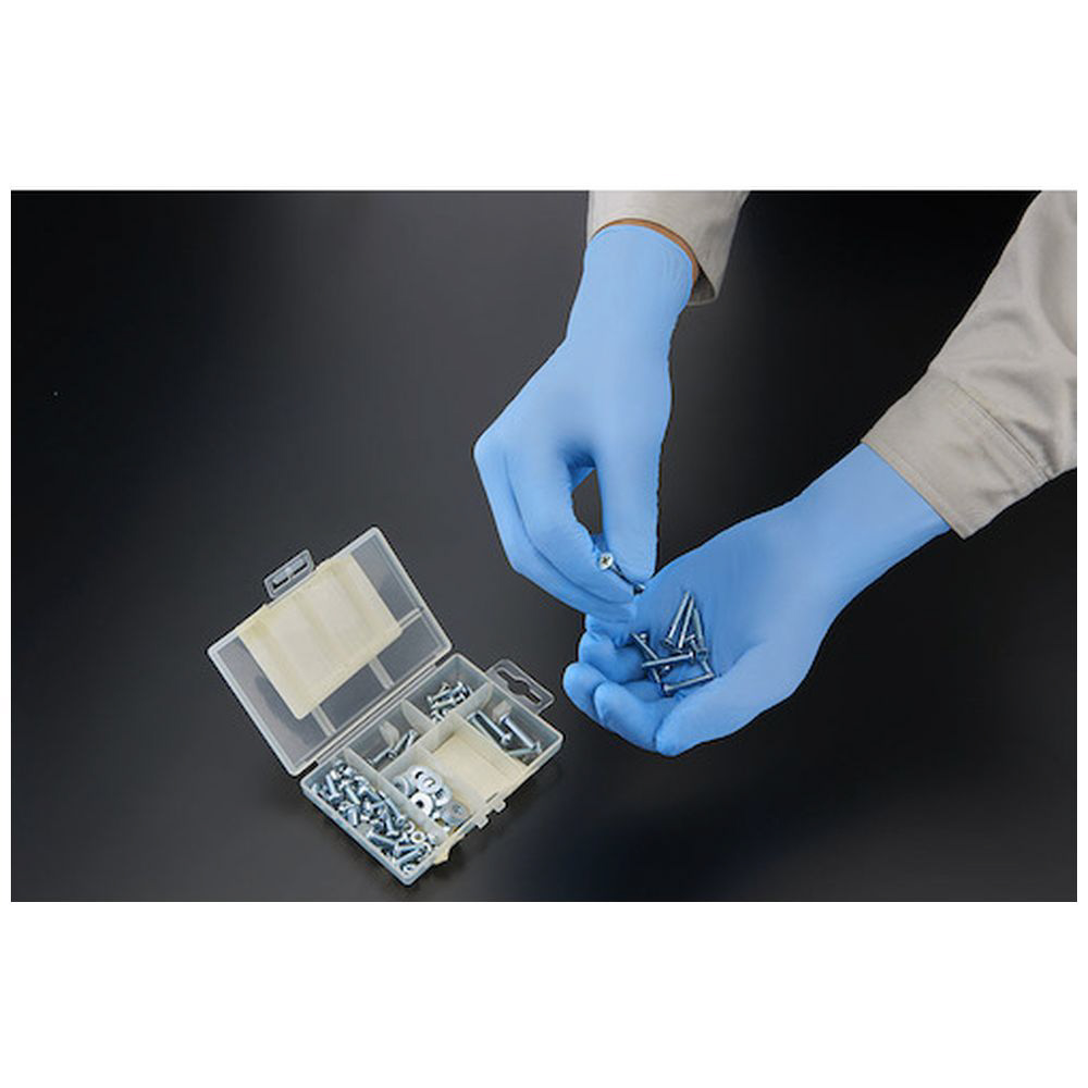 ■厚み約0.06mm、衛生的な粉なし(パウダーフリー)タイプの使い捨てニトリルゴム手袋(ニトリル手袋)。