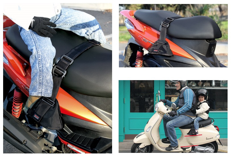多くのスクーターは、シート下にトランクルームを持つ事で非常に便利な反面、シートの高さと巾が大きくなる傾向があり、後席の子供の足は、一般のオートバイに比べ大変届きにくくなっています。