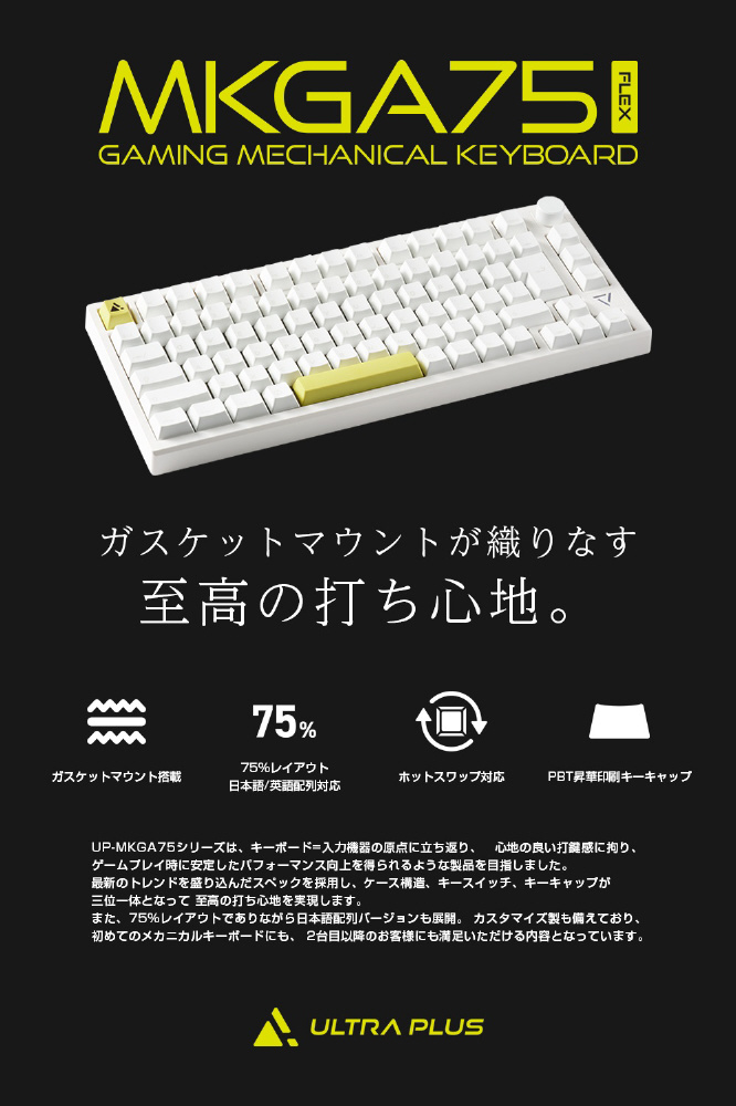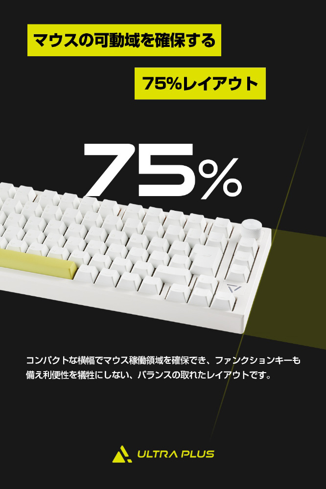 快適なゲームプレイ環境を想定し、テンキーを省いた75%レイアウトを採用。横幅がコンパクトなため、マウスの稼働領域の確保や片手用デバイスを設置する際に効力を発揮します。