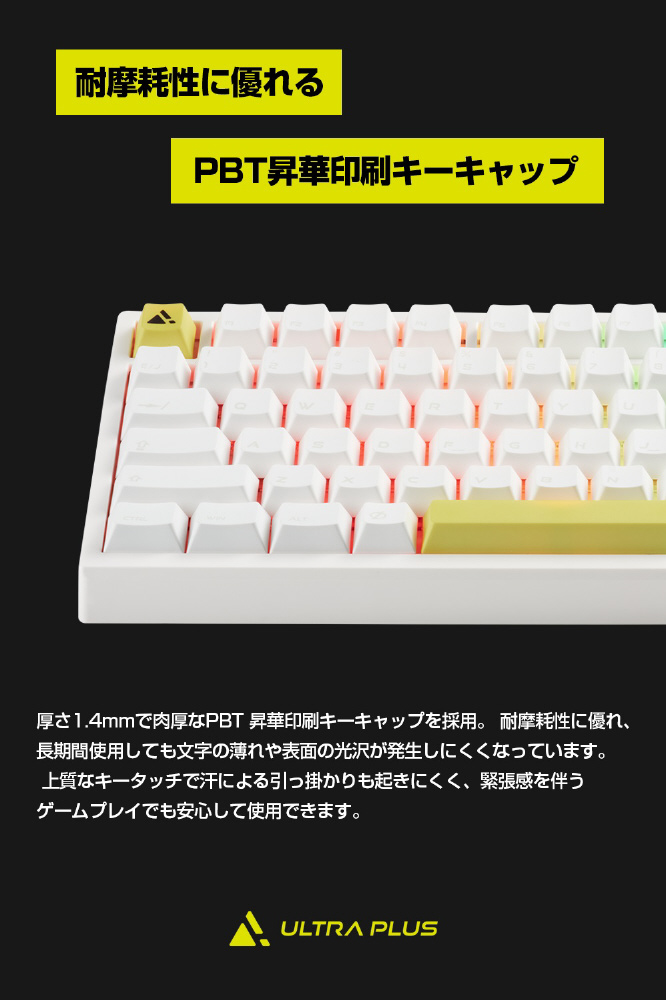 厚さ1.4mmで肉厚なPBT昇華印刷キーキャップを採用。長期間使用しても文字の薄れや表面の光沢化が発生しづらく、非常に耐久性が高いです。汗による指の引っ掛かりも起きにくく、緊張感を伴うゲームプレイでも安心です。