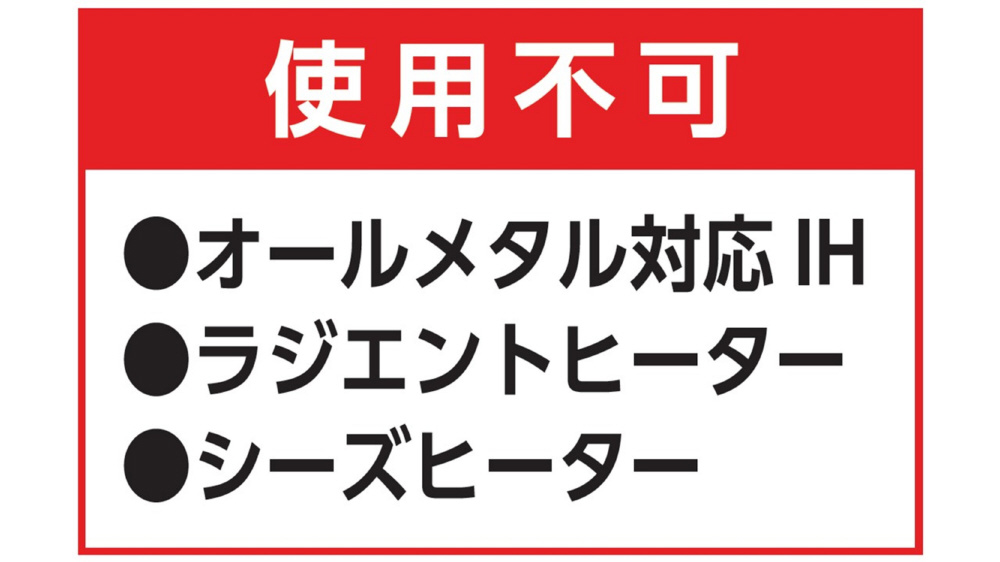 オールメタル対応のIHクッキングヒーター・ラジエントヒーター・シーズヒーターには使用できません。