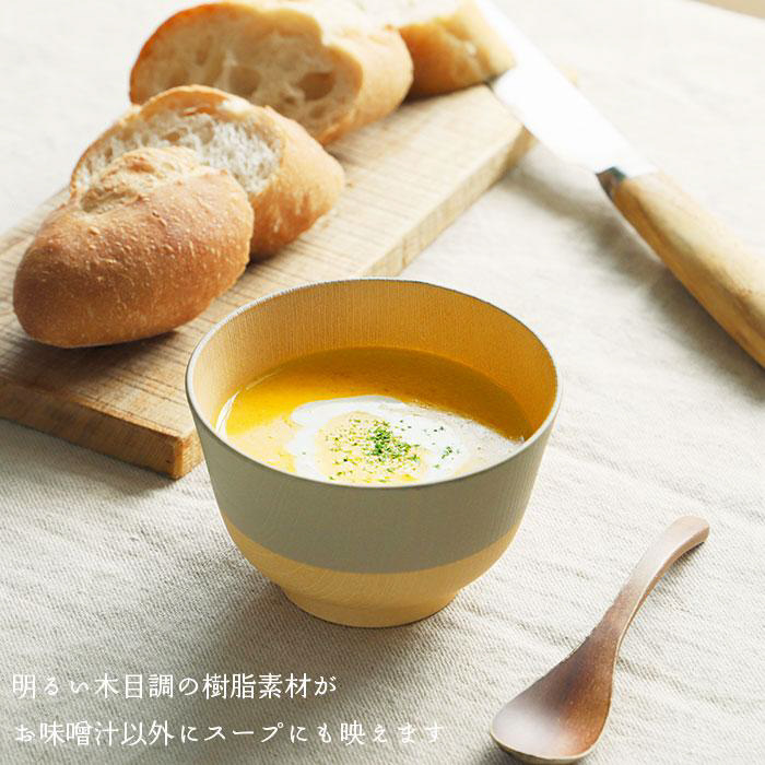 ■「やさしい彩り」シリーズは、明るい木目調の樹脂素材を日本古来の風雅な色彩で仕上げた和食にも洋食にも映えるテーブルウェア。