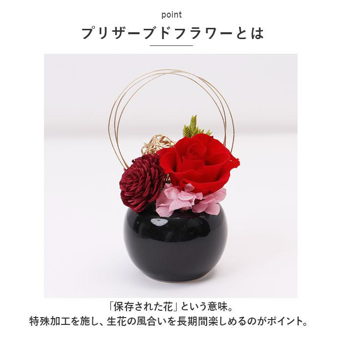 ・素材: [花] プリザーブドフラワー、ドライフラワー [容器] 陶器 [水引き] 和紙