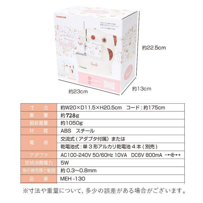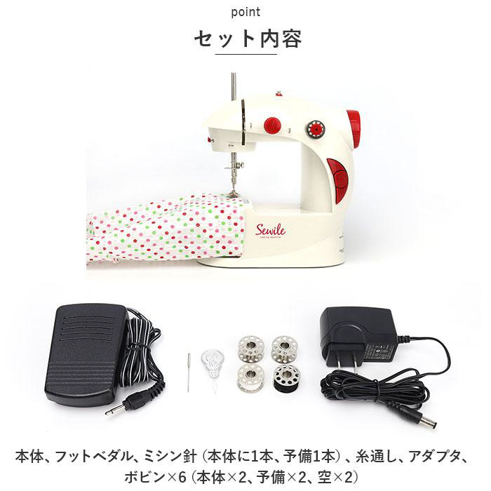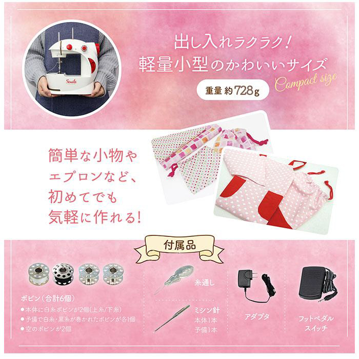 [付属品] ・保証書・フットペダルスイッチ・ミシン針(本体に1本、予備1本)・糸通し・アダプタ・ボビン(合計6個)
