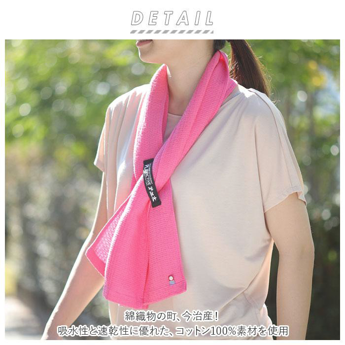 入浴後やトレ−ニングなどのアクティブシーンで活躍する、スポーツタオル!吸水性と速乾性に優れた、コットン100%素材を使用。