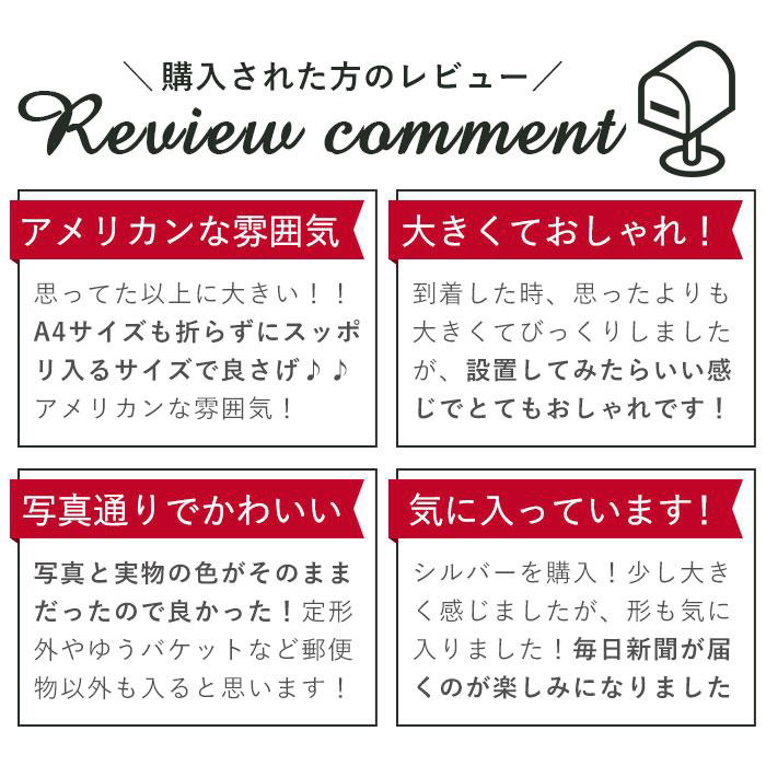 ・サイズ: ・外形寸法 [高さ] 約45cm [横幅] 約38cm [奥行] 約12.5cm・郵便物投入口サイズ [縦] 約3cm [横] 約32cm・郵便物取出し口サイズ [縦] 約22cm [横] 約32cm [ハンドル高さ] 約4.3cm・下部新聞受けスペース [上下幅] 約10cm [最大奥行] 約12cm