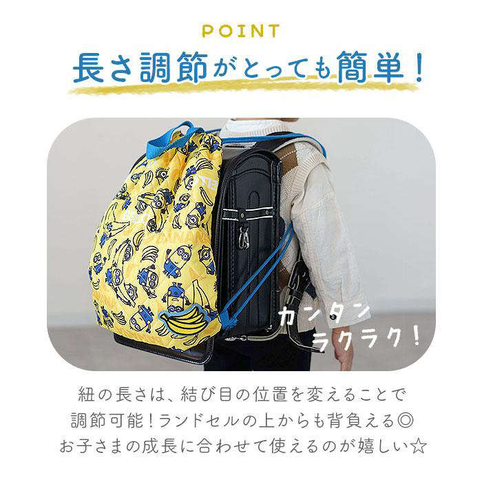 ■紐を長めにすると、ランドセルの上からも背負えて便利!