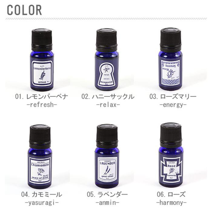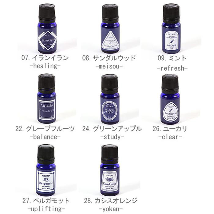 01.レモンバーベナ-refresh、02.ハニーサックル-relax、03.ローズマリー-energy、04.カモミール-yasuragi、05.ラベンダー-anmin、06.ローズ-harmony、07.イランイラン-healing、08.サンダルウッド-meisou、09.ミント-refresh、22.グレープフルーツ-balance、24.グリーンアップル-study、26.ユーカリ-clear、27.ベルガモット-uplifting、28.カシスオレンジ-yokan