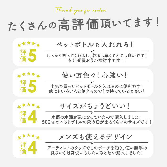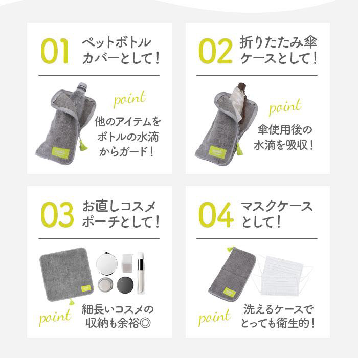 ■吸水性に優れたコットンパイル生地が、冷たいペットボトル、濡れた折りたたみ傘の水滴を吸い取って優しくカバー。