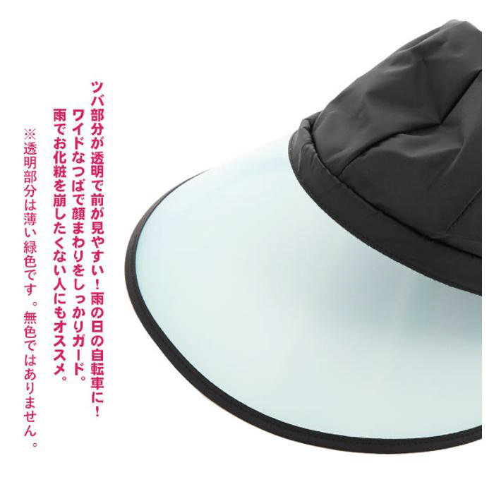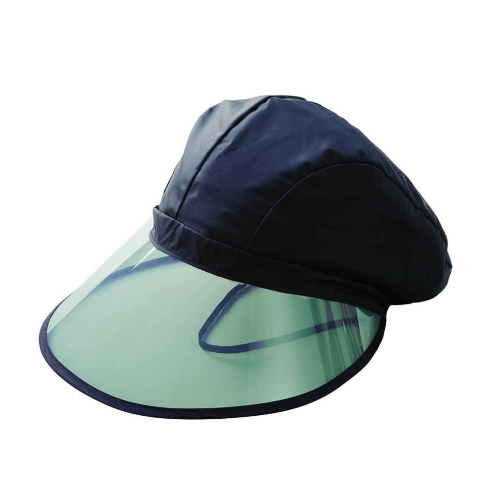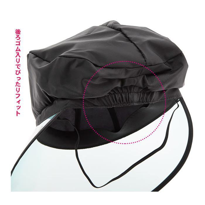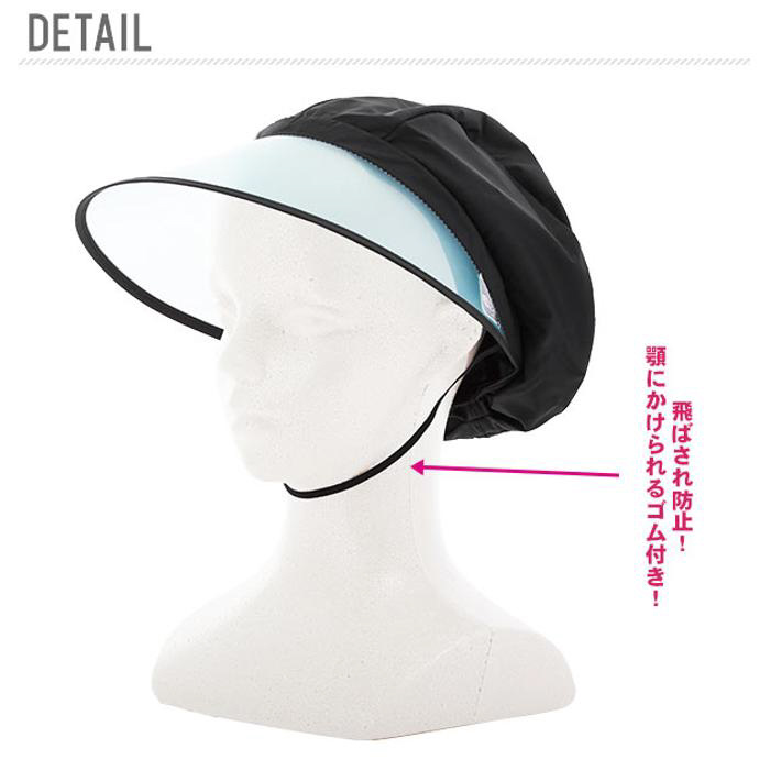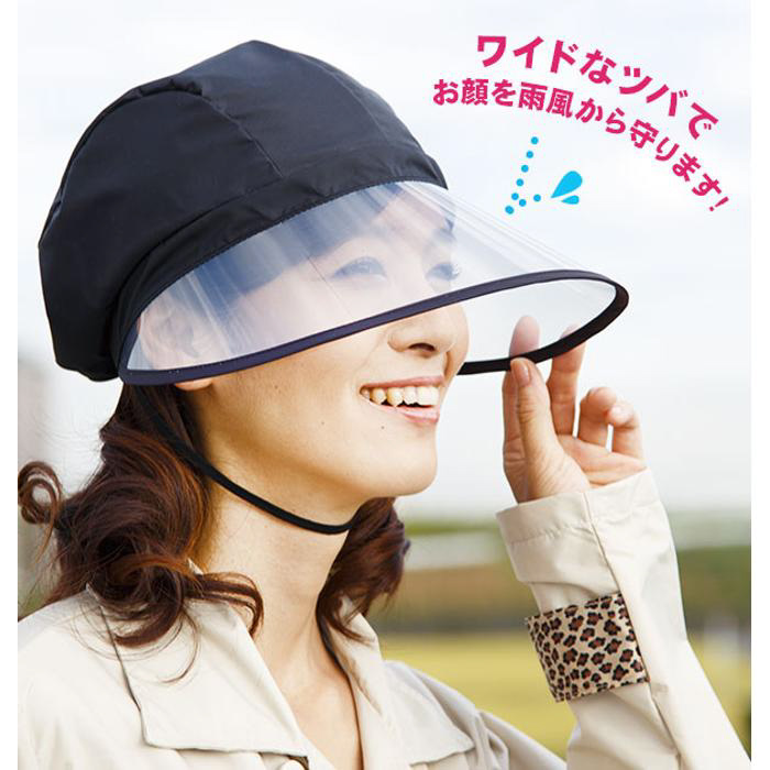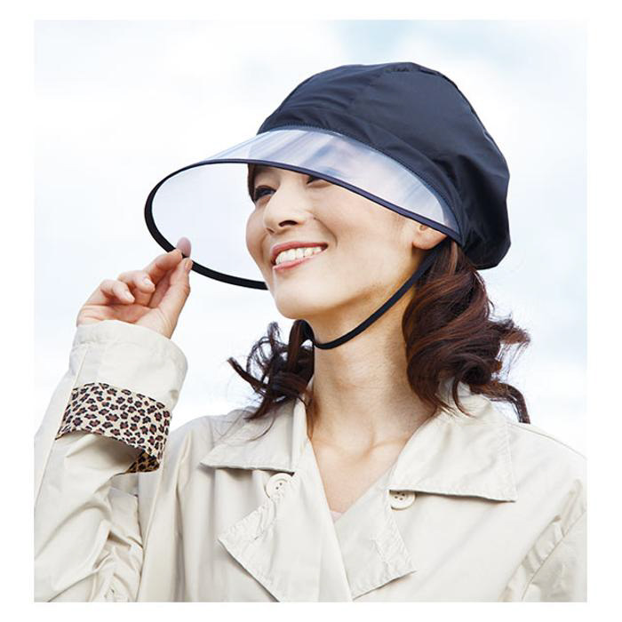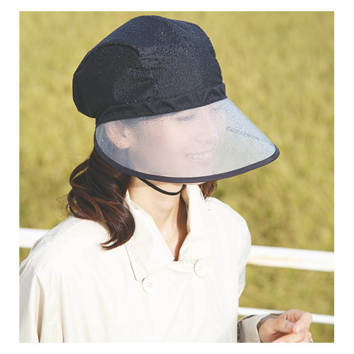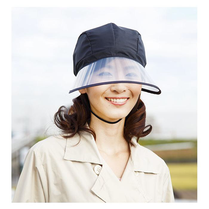 ■ツバ部分は透明になっており、雨の日でも前が見やすく、飛ばされ防止の顎にかけられるゴム付き。