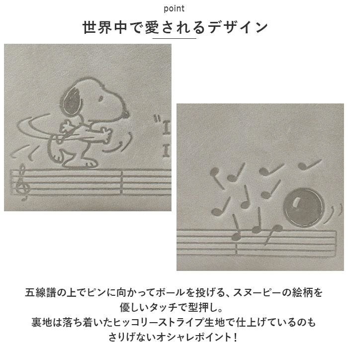 ■五線譜の上でピンに向かってボールを投げる、スヌーピーの絵柄を優しいタッチで型押し。
