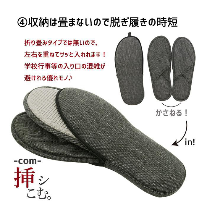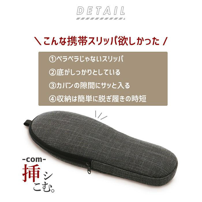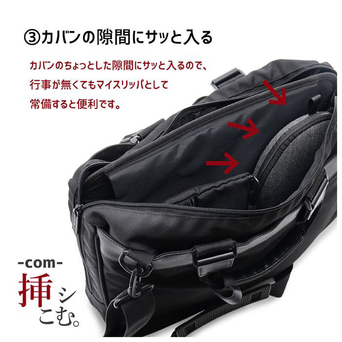 ■カバンすき間にサッと差し込める薄型携帯スリッパ、その名も「-com- 挿シこむ。