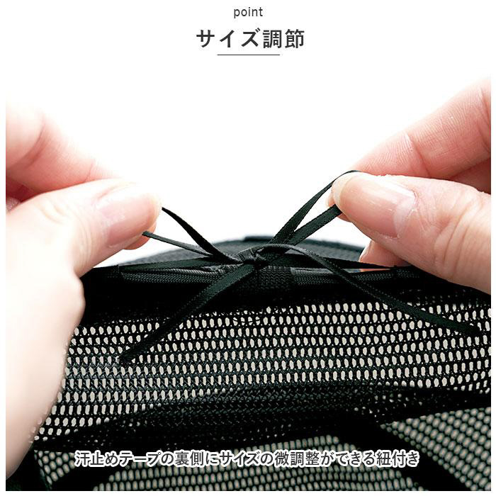 ■汗止めテープの裏側にサイズの微調整ができる紐付き。
