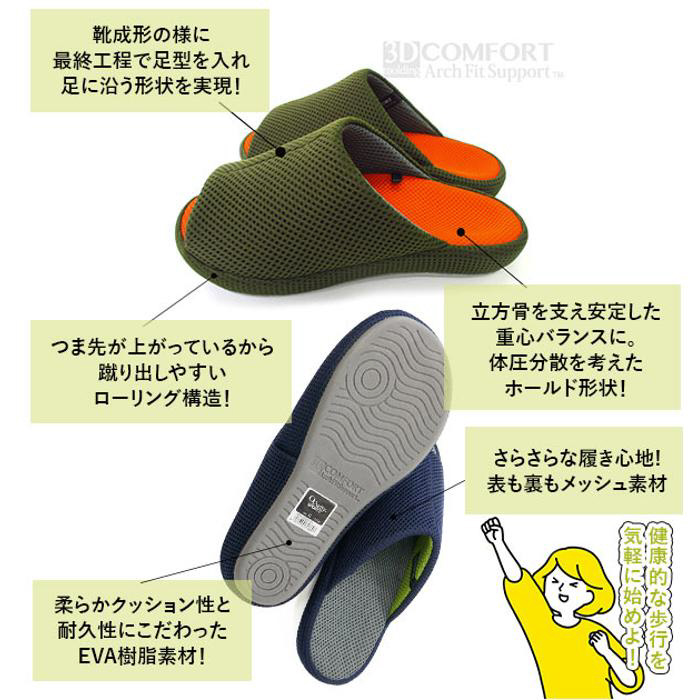 メッシュタイプの、足に優しい3次元構造のソールで安定させたスリッパです。