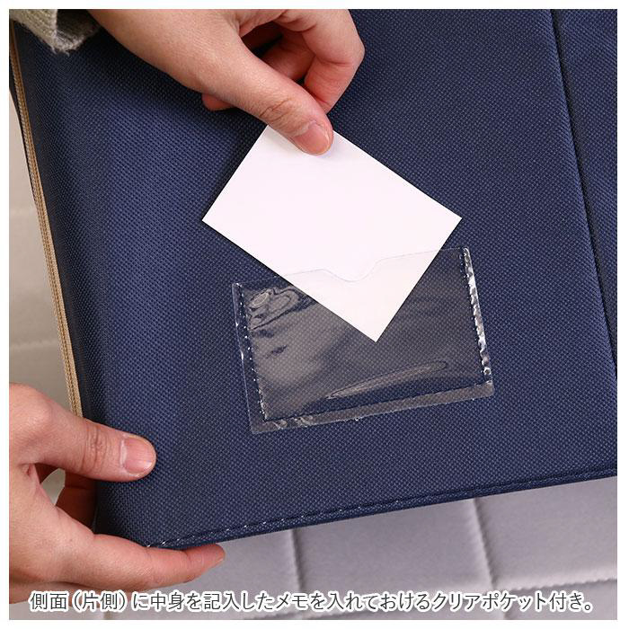 ■側面(片側)に中身を記入したメモを入れておけるクリアポケット付き。