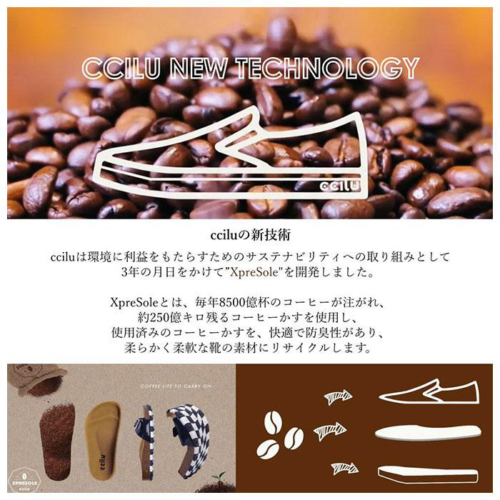 ■スリッポンのように気軽に履ける、ccilu(チル)の「GAIA CODY」アウトソールとインナーに、使用済みのコーヒーかすを再利用した「XpreSole(エクスプレッソール)」を採用。