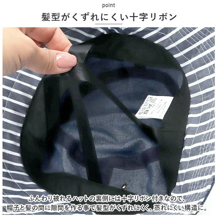 ■ふんわり被れるハットの裏側には十字リボン付きなので、帽子と髪の間に隙間を作ることで髪型がくずれにくく、蒸れにくい構造に。