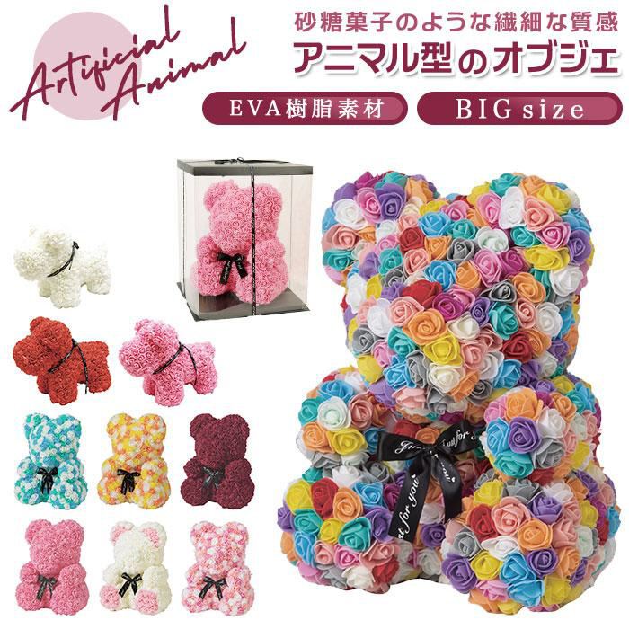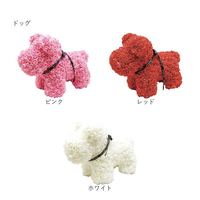 ■ちょこんとお座りしたクマさんと、今にも歩きだしそうなワンちゃんの置物をエレガントなバラの花で可愛くデコレーション。