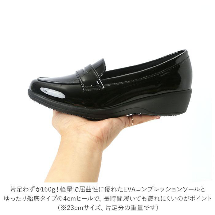 ■軽量で屈曲性に優れたEVAコンプレッションソールと、ゆったり船底タイプの4cmヒールで、長時間履いても疲れにくいのがポイント。(※23cmサイズ、片足分の重量です。)