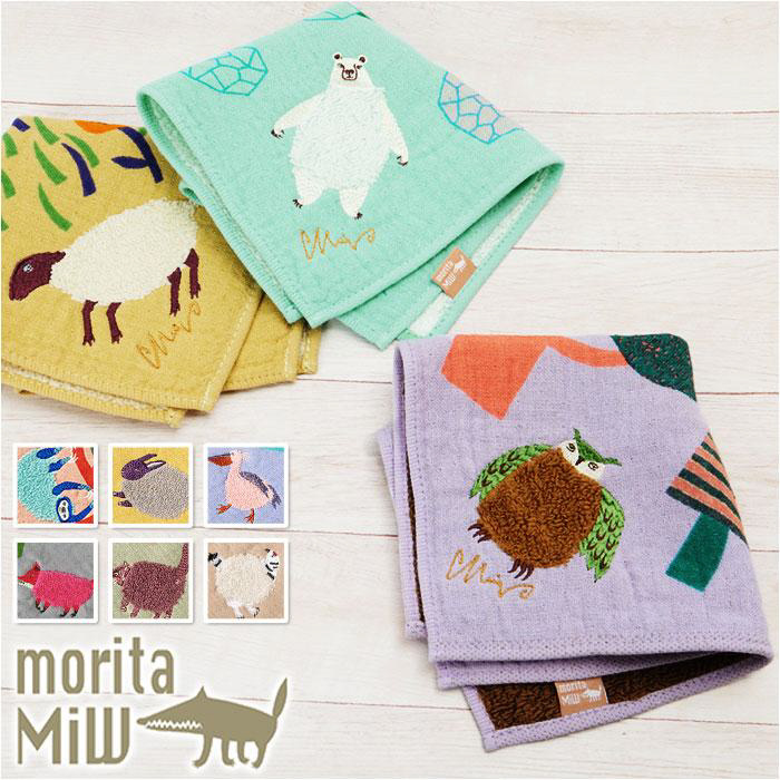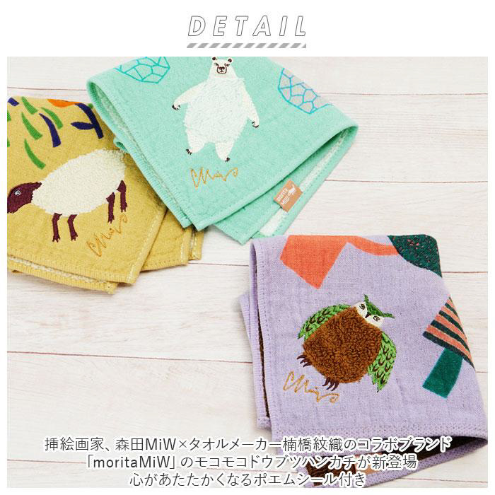 挿絵画家、森田MiW×タオルメーカー楠橋紋織のコラボブランド「moritaMiW」のモコモコドウブツハンカチが新登場。