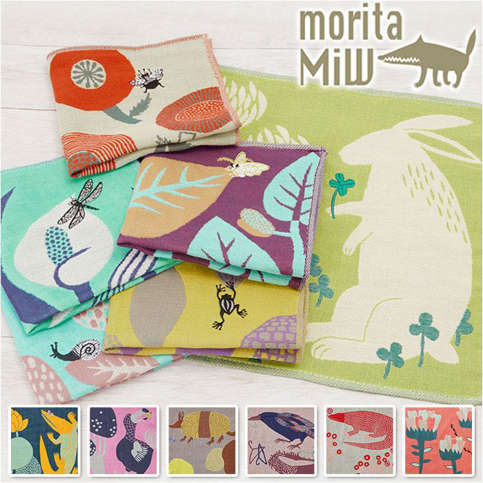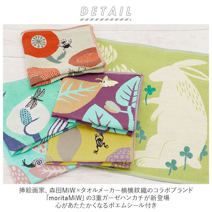 挿絵画家、森田MiW×タオルメーカー楠橋紋織のコラボブランド「moritaMiW」の3重ガーゼハンカチが新登場。