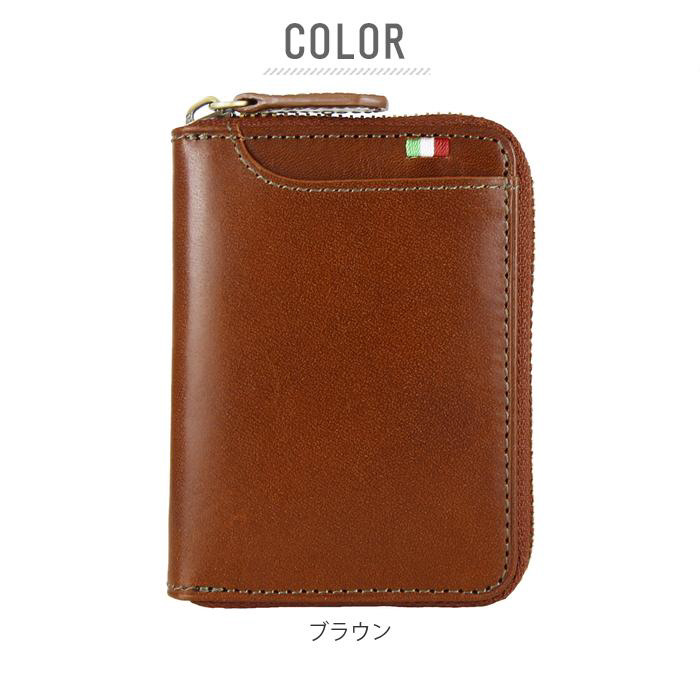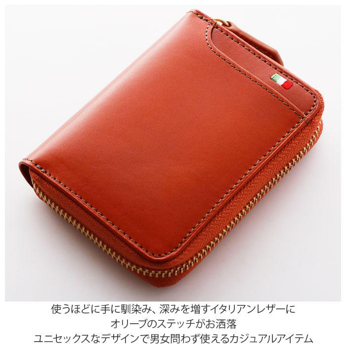 美しい光沢と滑らかな手触り。熟練の職人が手がける手染め技法でアンティークな雰囲気漂うイタリアンレザーは、ギフトにも最適横型のラウンドジップを開くとボックス型のコインケース。