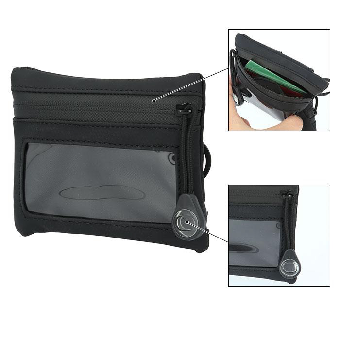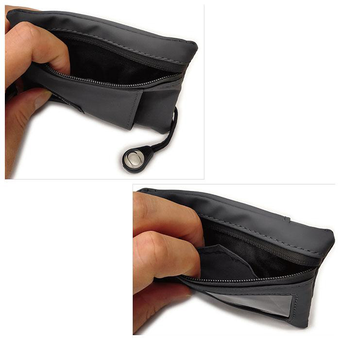■背面のファスナーポケットの内側は仕切りで2部屋に分かれていて、手前の部屋はクリア仕様で中が見えて便利。(サイズがあえば車のスマートキーも収納可能)フロントと背面のファスナーには止水ファスナーを採用。