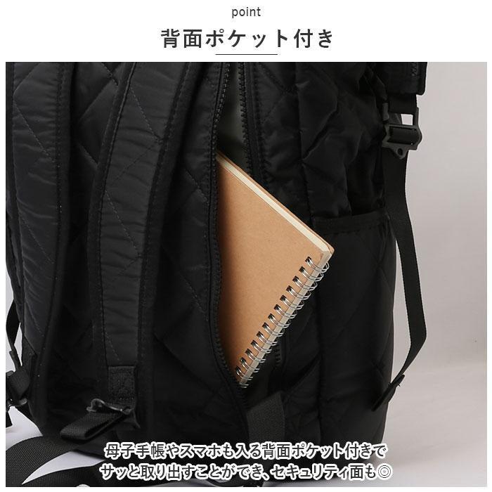 ■母子手帳やスマホも入る背面ポケット付きでサッと取り出すことができ、セキュリティ面も◎