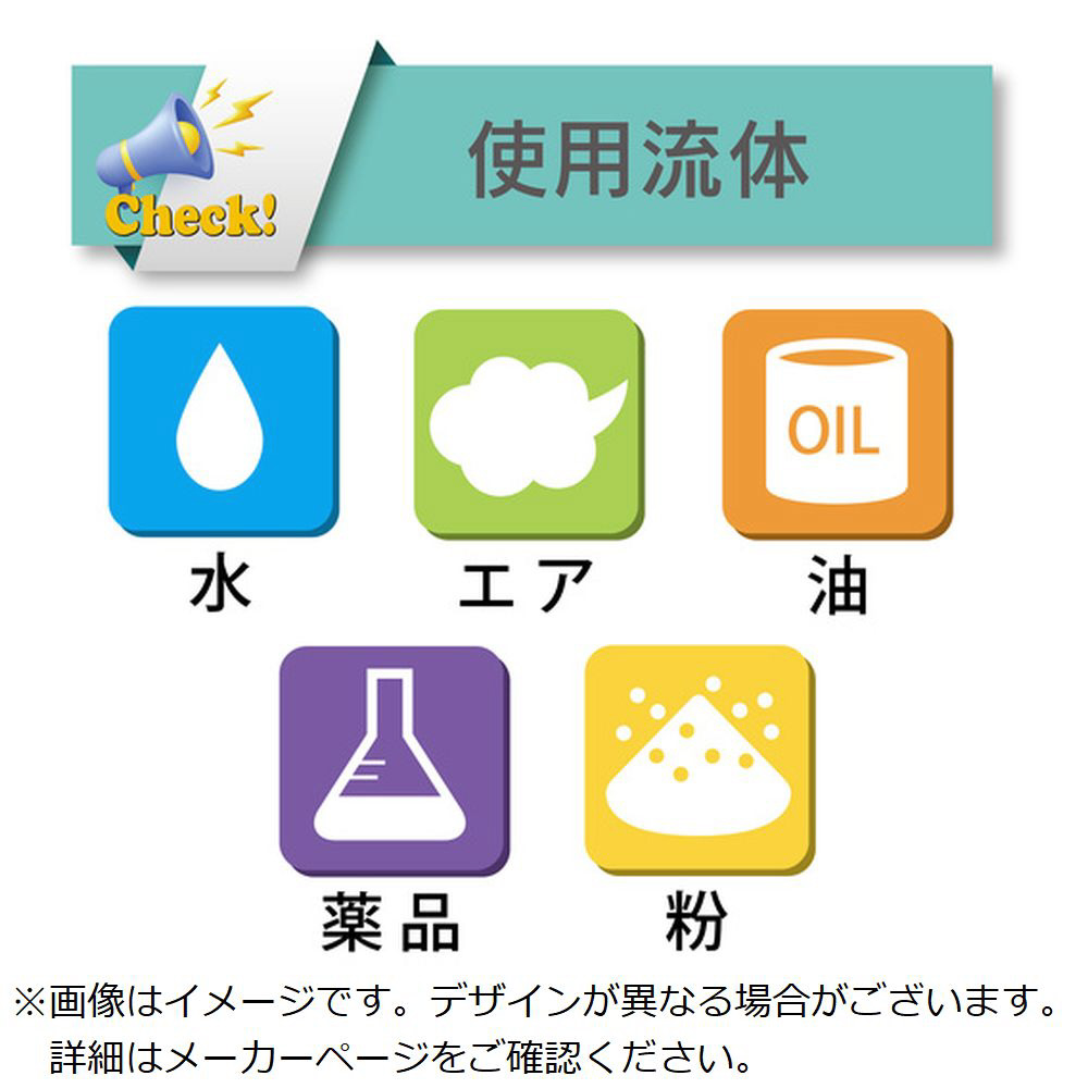 ・使用流体: 水(工業用水)、薬品、鉱物油、動植物油、粉体、空気