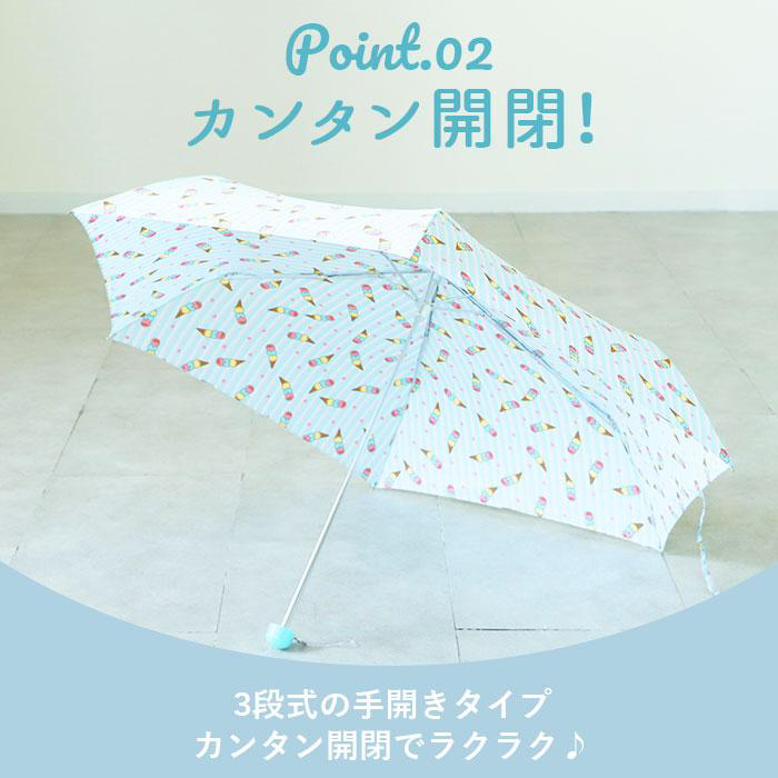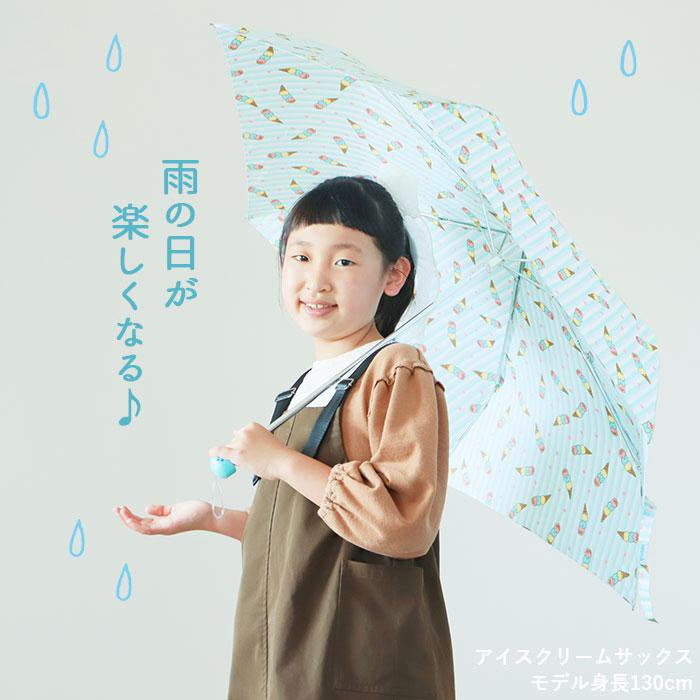 ■傘生地にはアイスクリームやコスメなど、女の子らしいアイテムを散りばめたデザインで、雨の日の学校も楽しくお出かけできる♪