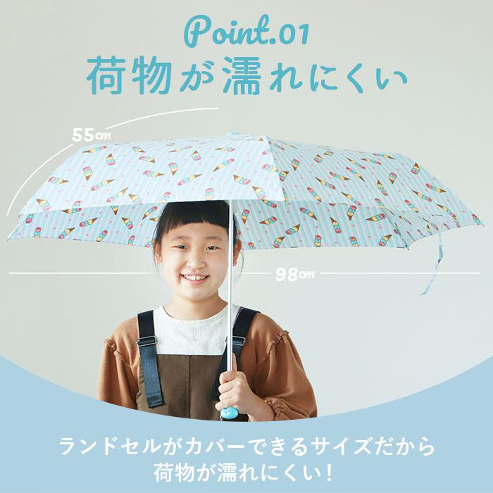■キッズ用コンパクト傘ながら、傘生地は直径約98cm親骨約55cmサイズに広がり、ランドセルもしっかりカバー!