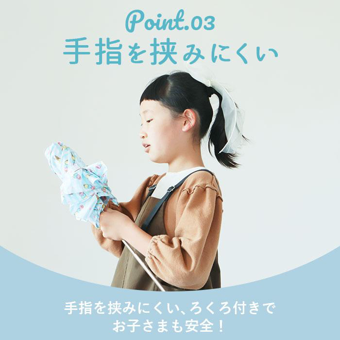 ■お子さまが手指を挟みにくいよう配慮された安全ろくろ付きで、傘生地がスムーズに開閉できる手開きタイプ。