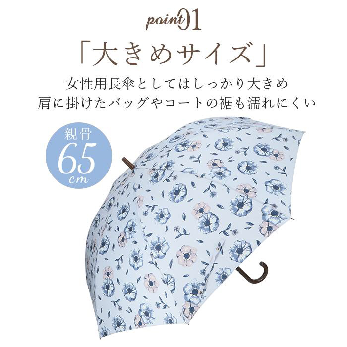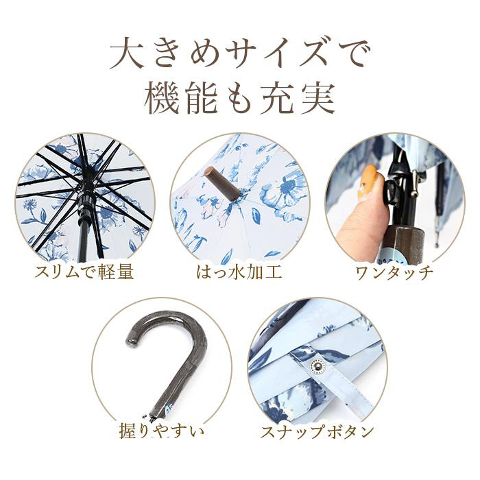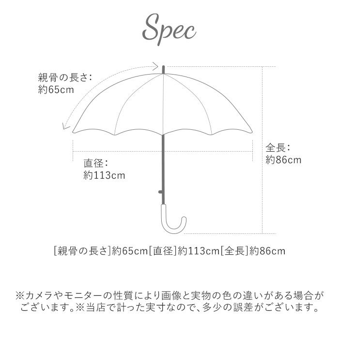 ■親骨の長さ約65cm、傘生地を広げた時の直径約113cmと女性用長傘としてはしっかり大きめサイズ。