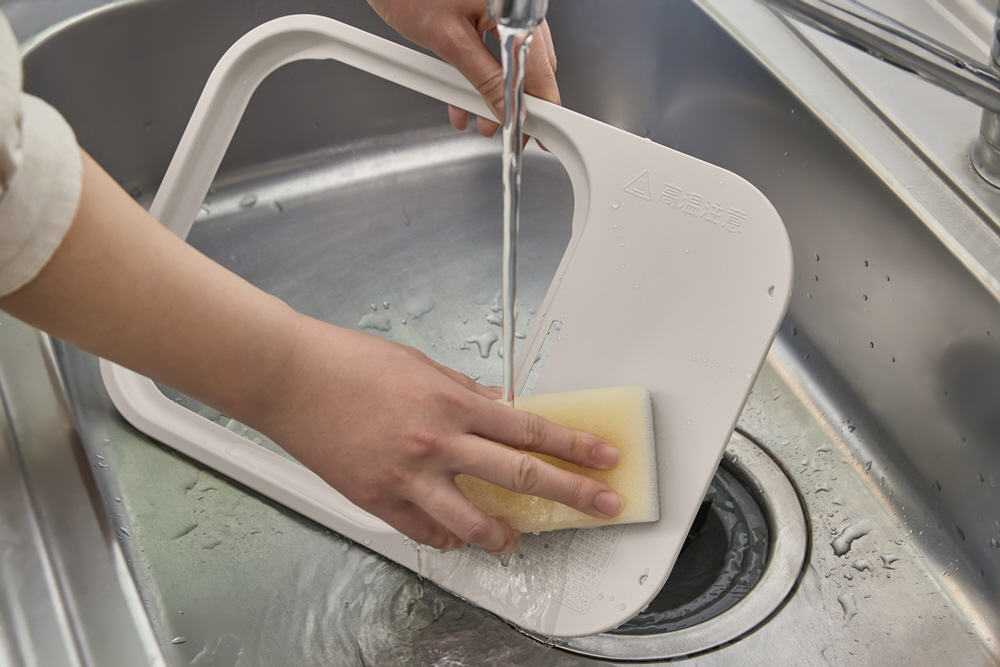 ■煙が出ることに対する不満を解消するために、水トレイを設置し、グリルプレート表面温度を一定に保ちながら調理時の脂を受けることで、煙が出にくい構造にしました。