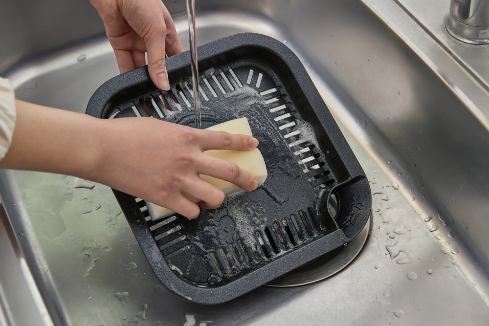 水トレイで煙を抑え、お手入れ簡単なフッ素加工プレート付き。