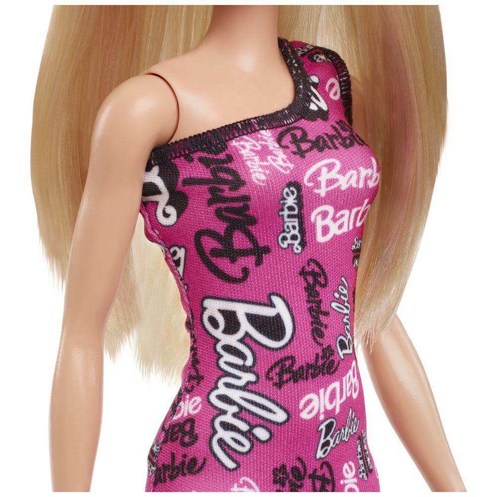 バービーのロゴがプリントされたカラフルなピンクのドレスを着たバービーです。