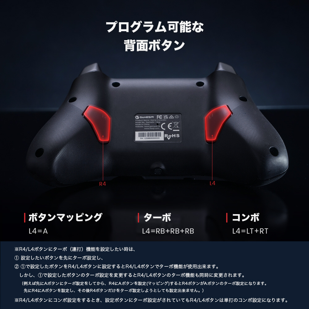 また、MボタンとL4orR4ボタン(背面ボタン)を押した後、設定したい操作をおこなうことでL4ボタン、R4ボタンにお好みの操作を割り当てることが可能です。