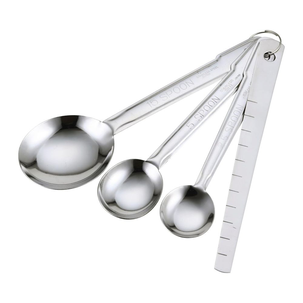 大さじ1(15ml)、小さじ1(5ml)、小さじ1/2(2.5ml)の3本に、すりきりヘラがついたステンレス製の計量スプーンセット