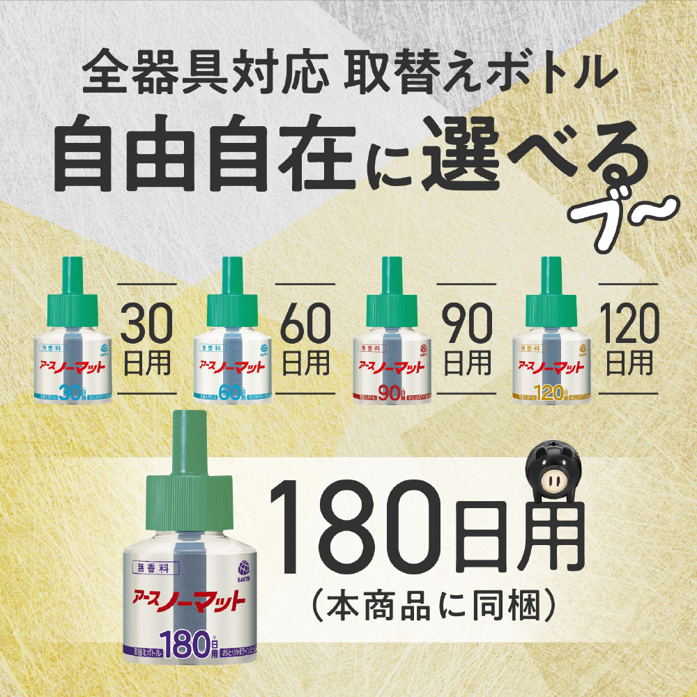機能そのまま、光るしっぽ型スイッチがキュートなかわいい蚊とりブタ型ノーマット器具と、低刺激・無香料の180日用取替えボトルのセットです。すぐれた殺虫効果と安定した効きめ。屋外からの蚊の侵入も防ぎます。※数量限定品です