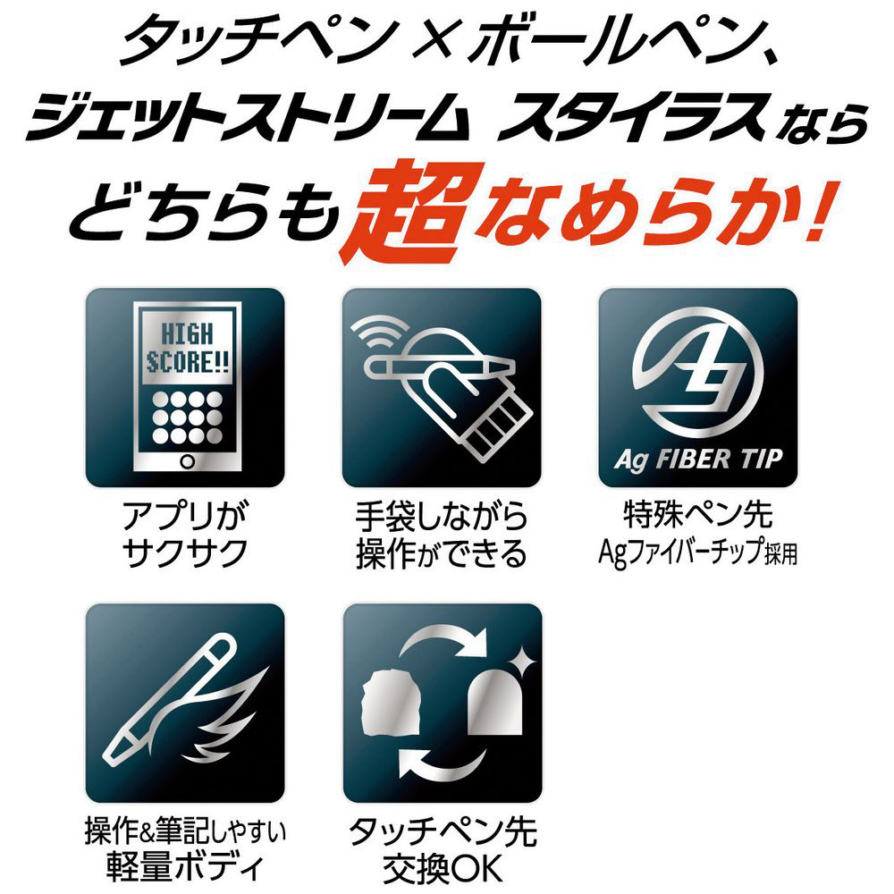 ●なめらかな書き味の油性ボールペン『ジェットストリーム』に、静電容量式スマートフォン・タブレット端末に軽いタッチでなめらかに操作できるタッチペンを搭載したスタイラスペンです。