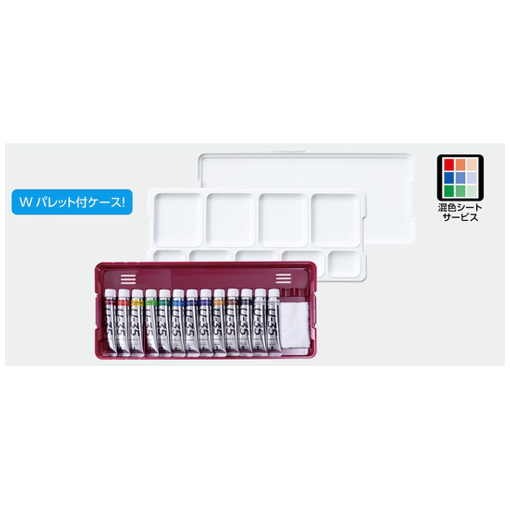 セット内容:■12色20mlチューブ各1本+ホワイト20mlチューブ1本 ■Wパレット付PPケース、ミニタオル付