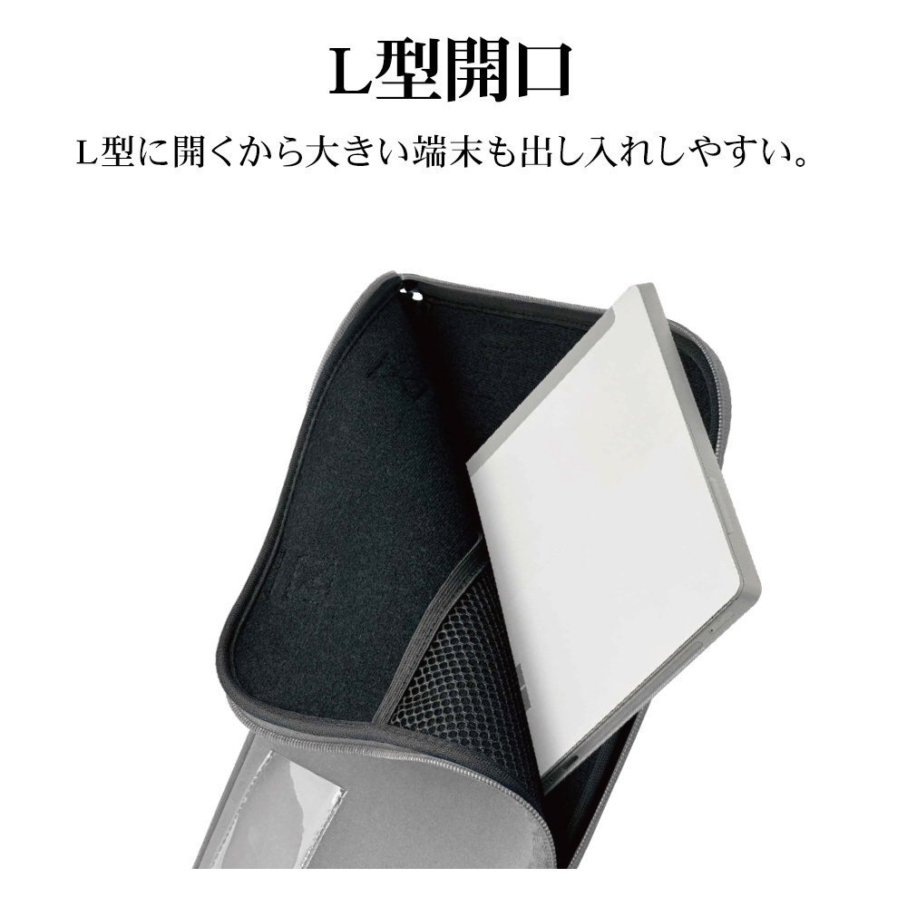 ■L形に開くから大きい端末も出し入れしやすい。