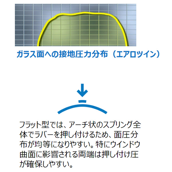 スポイラー付きのフォルムは、空気抵抗による浮き上がりを押さえ、マイナスリフトを実現。フロントガラスへの密着性が向上し、高速走行時でも確実な払拭性能を発揮、風切り音を大幅に低減。
