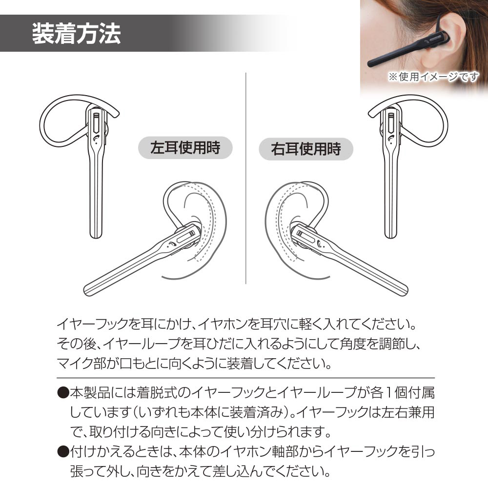 付属品 専用充電コード、イヤーフック(本体に装着済み)、イヤーループ(本体に装着済み)、保証書、取扱説明書