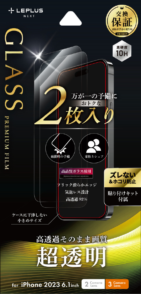 iPhone 15/15 Pro ガラスフィルム 「GLASS PREMIUM FILM」 2枚入り 超透明 LN-IM23FG2SET