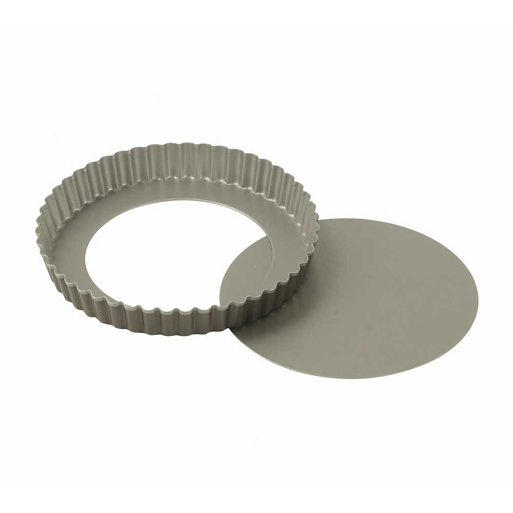 こびりつきにくく、お手入れ簡単なふっ素樹脂加工の底取れ式タルト型(18cm)。